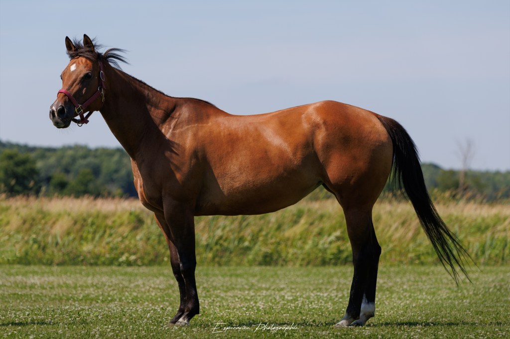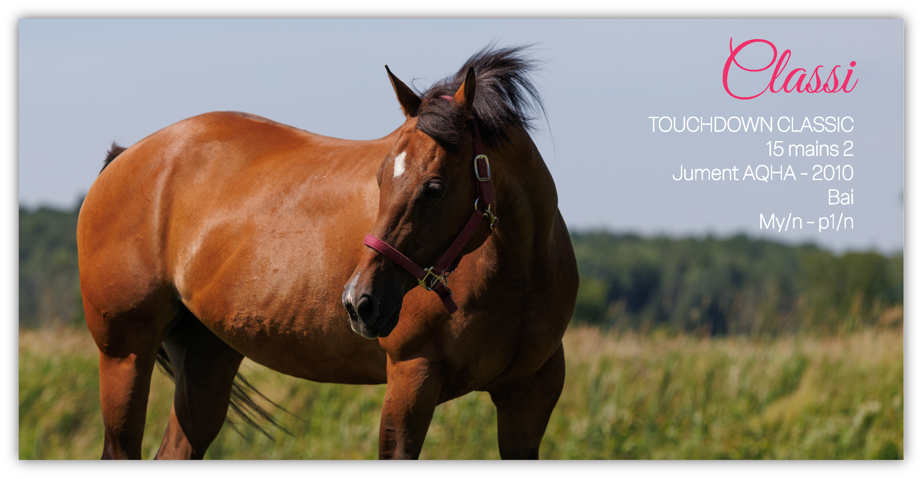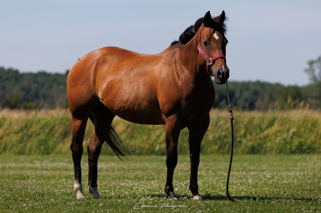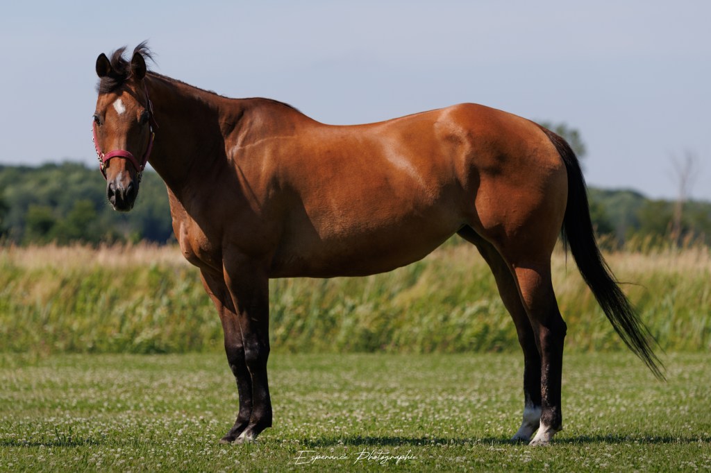 Classi est une jument AQHA née en 2010 que nous avons acheté pour le programme de reproduction de l’écurie. Elle a fait de la compétition plus jeune, mais sa carrière a été écourtée dû à un accident aux pattes arrière. Tout ça est derrière elle maintenant, mais ça la limite légèrement dans son travail. Elle a eu sa première pouliche en 2025 à l’écurie, mais elle n’est pas fait pour la lactation. Elle a eu la chance de n’avoir que 2 propriétaire et d’être bien toute sa vie, je veux que cela continu, il lui reste encore plusieurs belles années!