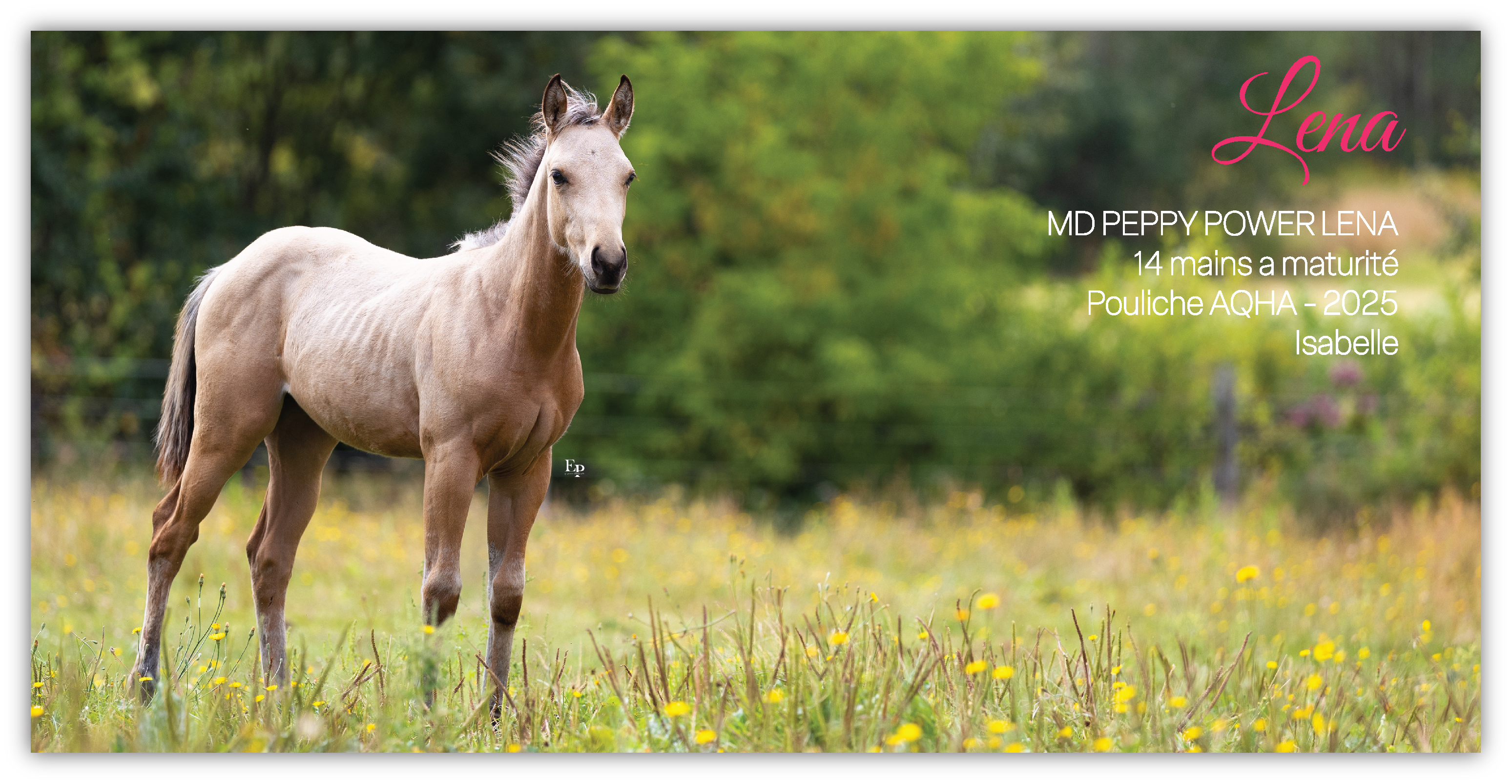 Lena est une pouliche née de notre élevage, sortie de la jument 𝑀𝐽 𝑃𝑂𝑊𝐸𝑅𝑃𝐿𝐴𝑌 𝐿𝐸𝑁𝐴 par l’étalon 𝑃𝐸𝑃𝑃𝑌 𝑃𝐼𝑁𝐸 𝑇𝐴𝑈𝑅. Née le 26 avril 2025, elle devrait faire environ 14 mains à maturité.